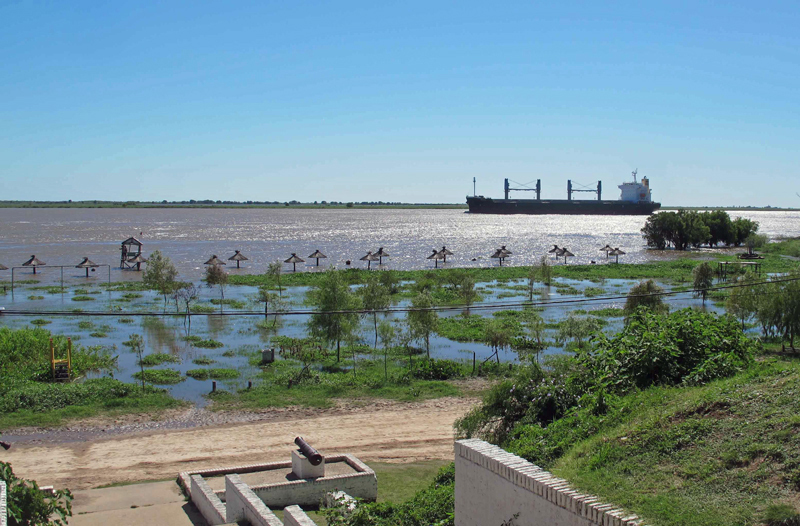 In the 1830s and 40s, Britain and France had been engaged in a complex and ineffectual military intervention around the River Plate. France concentrated on Uruguay, while Britain was concerned with Argentina, as many British merchants had settled around Buenos Aires and were suffering under various restrictions. The leader of Argentina, General Juan Manuel de ROSAS, wanted Uruguay and Paraguay to remain part of the Argentine Confederation and imposed a blockade of the River Plate to isolate rebels in Paraguay who wanted to secede from the Confederation (and who later declared Paraguay independent). Rosas closed the river Paraná by a ‘boom’ (a chain across the river), which brought trade in the area to a standstill and harmed British interests in South America. Britain and France sent military forces to oppose the blockade, and at the bend (vuelta) of the Paraná at a place called Obligado, there was a battle on 20 November 1845, in which the Anglo-French expedition broke Rosas’s chain, thus raising his blockade, and escorted upriver over a hundred merchant ships that had been waiting at Montevideo. The Argentine defenders lost the battle, but their heroic fight against the European forces inspired them with patriotism and united them behind Rosas. The Battle of the Vuelta de Obligado thus became one of the defining symbols of Argentina’s rise to nationhood.